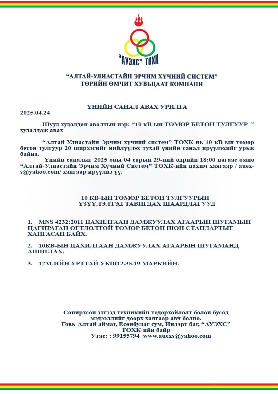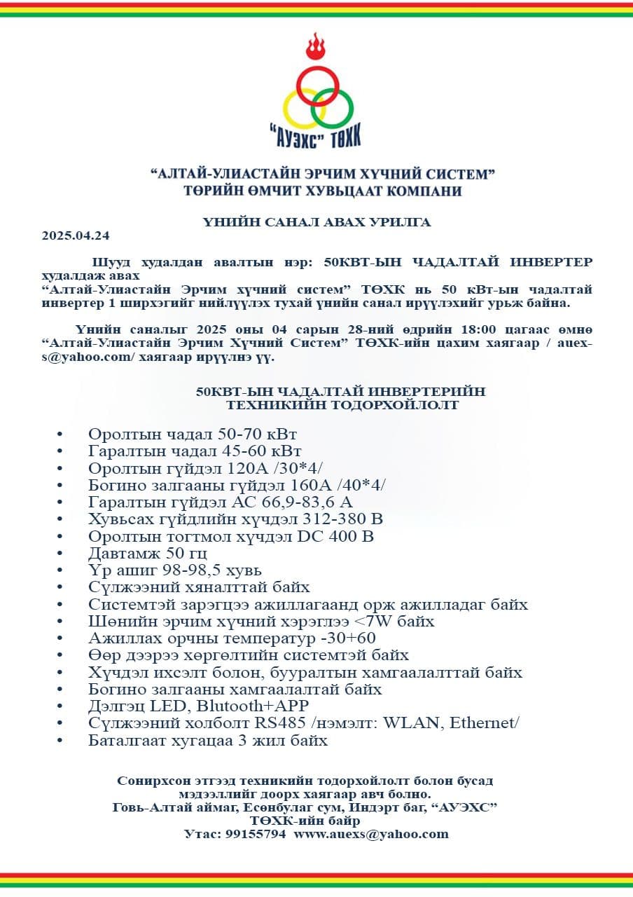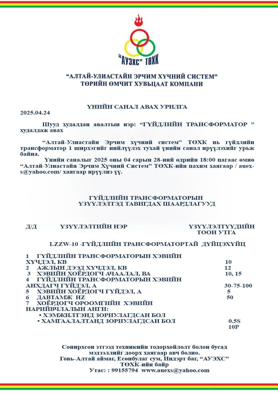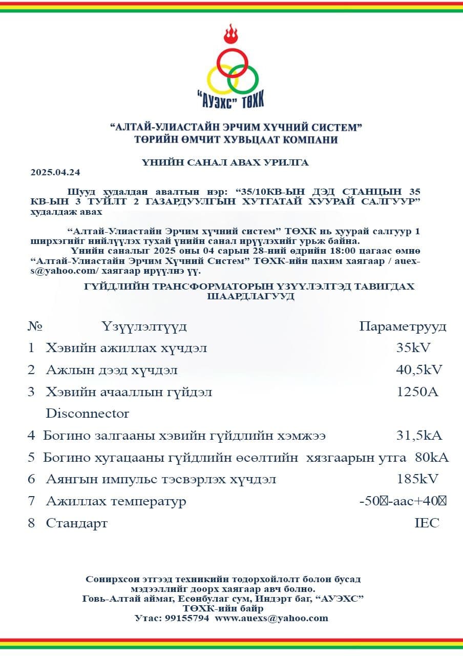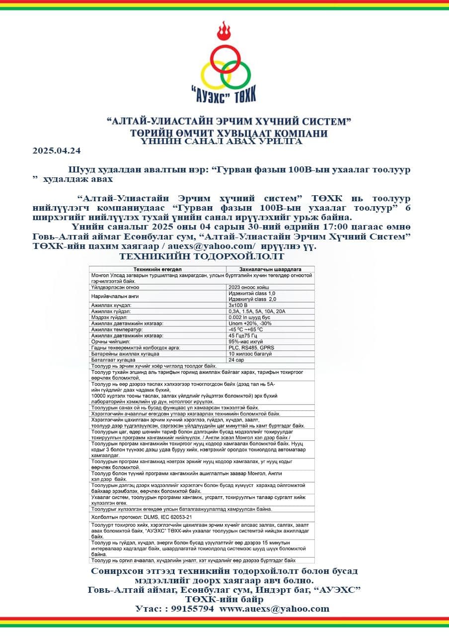 © 2025 он. АЛТАЙ-УЛИАСТАЙН ЭРЧИМ ХҮЧНИЙ СИСТЕМ ТӨРИЙН ӨМЧИТ ХУВЬЦААТ КОМПАНИ.
